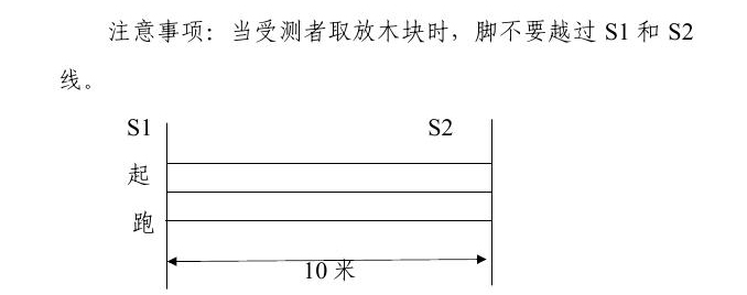 测评方法为:受测者用站立式起跑,听到发令后从S1线外起跑,当跑到 S2 线前面,用一只手拿起一木块随即往回跑,跑到S1线前时交换木块,再跑回S2交换另一木块,最后持木块冲出 S1线,记录跑完全程的时间。记录以秒为单位,取一位小数,第二位小数非“0”时则进1。