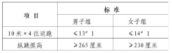 测评方法为:准备测试阶段,受测者双脚自然分开,呈站立姿势。接到指令后,受测者屈腿半蹲,双臂尽力后摆.然后向前上方快速摆臂,双腿同时发力,尽力垂直向上起跳同时单手举起触摸固定的高度线或高度标识,触摸到高度线或者高度标识的视为合格。测试不超过三次。
