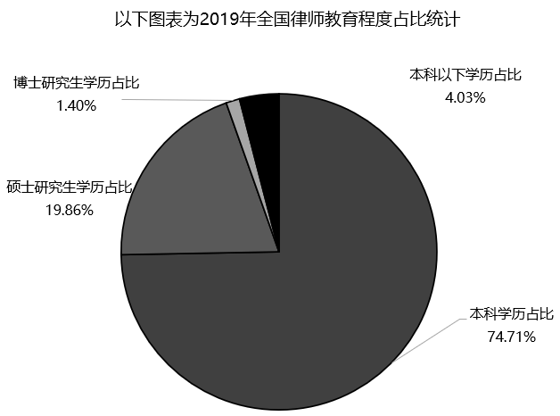 截至2019年底,全国共有执业律师47.3万人。其中专职律师占84%,兼职律师占2.66%,公职律师占9.17%,公司律师占2.31%,军队律师占0.32%。2019年,全国律师办理各类法律事务1119万件。其中,办理诉讼案件占比54.6%,办理非诉讼法律事务占比11.9%。刑事诉讼辩护及代理占诉讼案件的17.91%;民事诉讼代理占诉讼案件的78.45%;行政诉讼代理占诉讼案件的3.1%;代理申诉占诉讼案件的0.54%。
