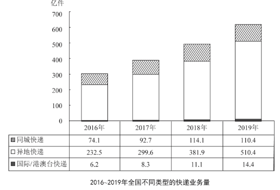 99、如保持2019年同比增量不变,则全国异地快递业务量将在哪一年首次达到同城快递业务量的10倍以上?