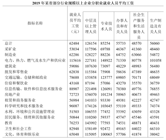 2019年某省规模以上企业就业人员年平均工资为62484元,比上年增长10.1%。其中,中层及以上管理人员增长9.7%;专业技术人员增长20.7%;办事人员和有关人员增长5.7%;社会生产服务和生活服务人员增长8.5%;生产制造及有关人员增长9.7%。