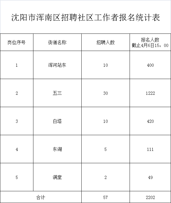 根据《沈阳市浑南区公开招聘社区工作者招聘简章》要求,现面向社会公布各岗位报名累计人数,该数据仅供参考不作为最终资格初审通过人数。其他渠道转载请注明转自沈阳高新人力资源服务有限公司公众号。各岗位报名累计人数情况如下: