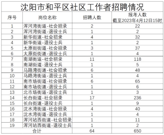 根据《2023年和平区公开招录社区工作者公告》要求,现面向社会公布各岗位报名累计人数,该数据仅供参考不作为最终资格初审通过人数。其他渠道转载请注明转自辽宁教育人才培训网公众号。各岗位报名累计人数情况如下: