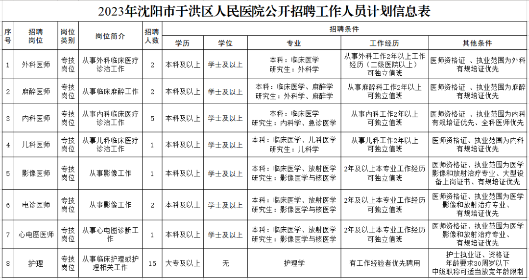联系部门:沈阳市于洪区人民医院人事科